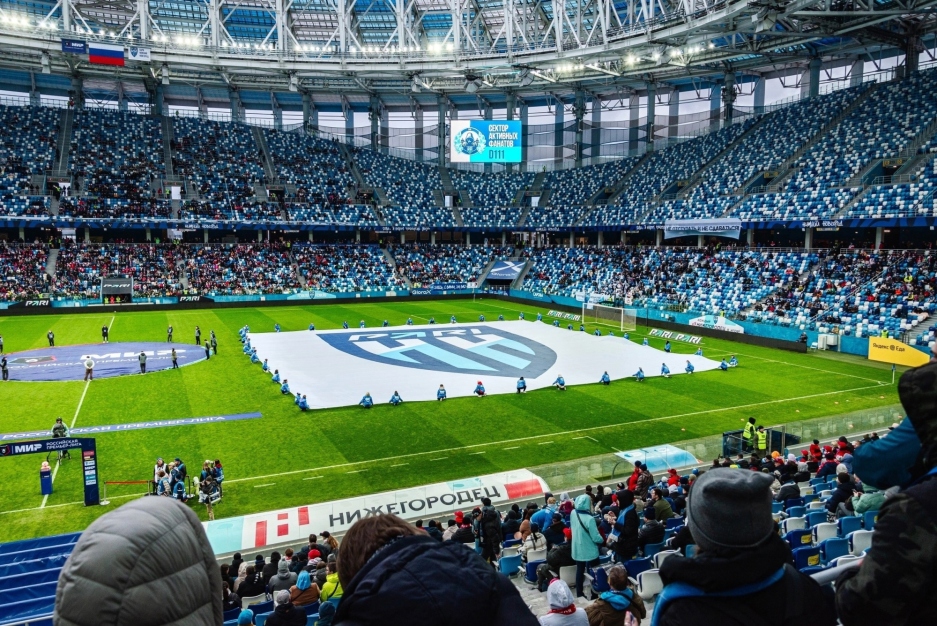 Более 100 волонтёров разворачивали флаги Нижегородской области и ФК «Пари НН» перед домашними матчами на стадионе.