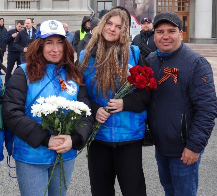 На площади Куйбышева добровольцы сопровождали ветеранов Великой Отечественной войны, представителей ветеранских организаций, встречали участников специальной военной операции, почётных гостей и зрителей на трибунах, помогали в навигации у контрольно-пропускных пунктов. Также во время Парада волонтёры вручали всем Георгиевские ленты, а «серебряные» добровольцы провели акцию «Красная гвоздика».
