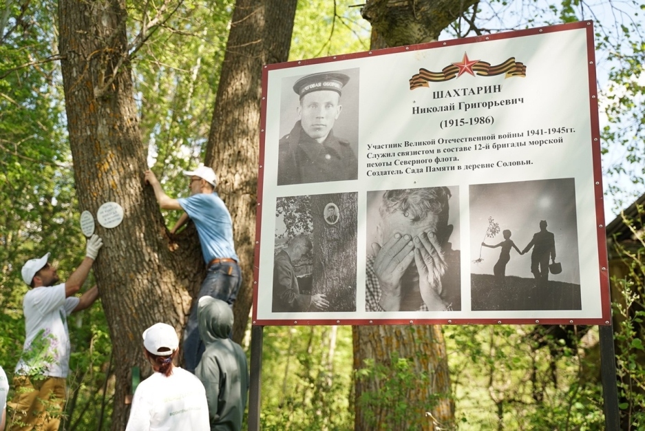 На протяжении 25 лет Шахтарин Николай Григорьевич сажал и обустраивал сад памяти. На каждом из посаженных в нём деревьях была закреплена табличка с именем погибшего на фронте уроженца деревни Соловьи или какой-либо из соседних деревень. Несмотря на слепоту, Николай Григорьевич трудился по 12 часов в сутки. Семь лет понадобилось на создание пруда напоминавшего ветерану о его службе на море. В центре сада была построена не глубокая землянка, на стенах которой по просьбе Николая Григорьевича, его сын написал историю создания сада, биографию его создателя и приписал: «Пусть катера плывут по мирному Баренцеву морю, в котором я стал инвалидом. Пусть эта многострадальная война никогда не повторится».