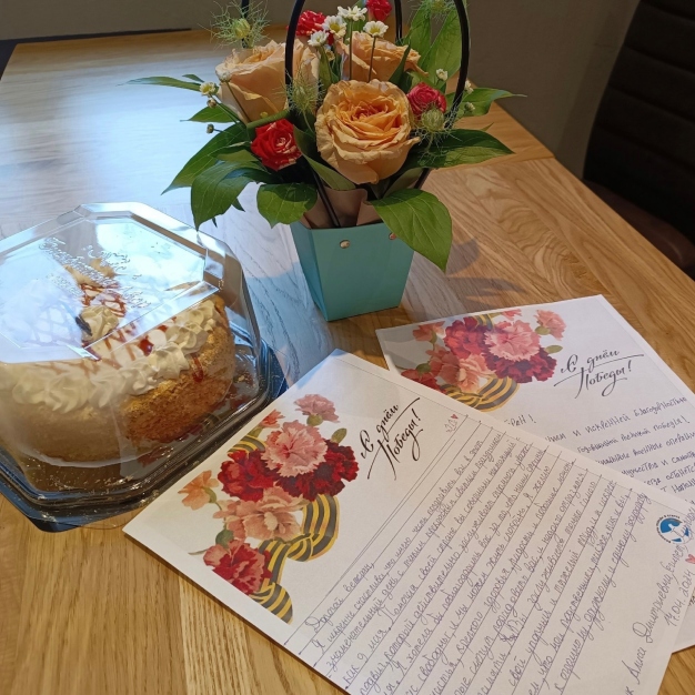 Вместе с праздничным букетом и вкусным тортом Волонтёры Победы передали письма представителей Волонтёров Победы из Египта.