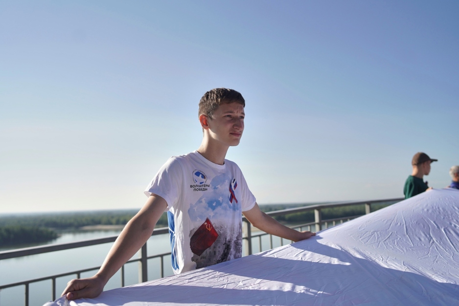 А после прошло праздничное шествие по улице Мало-Тобольской, проспекту Ленина и набережной Оби. Волонтёры Победы, молодогвардейцы, члены партии «Единая Россия», депутаты Барнаульской городской Думы, молодые парламентарии и все желающие барнаульцы пронесли 50-метровый флаг Российской Федерации. Волонтёры Победы регионального отделения стали одними из тех, кто с гордостью и чувством сопричастности с Родиной смог пронести полотно флага нашей страны по улицам города.