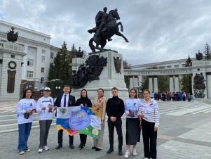 Волонтёры Победы, вышли к величественному памятнику генерала Шаймуратова и раздали георгиевские ленты на центральных улицах Уфы.