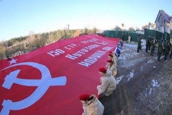 В честь фронтовика был утроен парад, перед которым Волонтеры Победы, Юнармейцы и школьники развернули "Знамя Победы" - увеличенную реплику "Знамени Победы" почти 800 квадратных метров и исполнили его любимую песню «Стоим мы на посту!»!