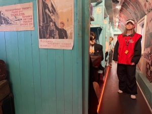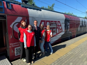 «Поезд Победы» — уникальный передвижной музей. В пространстве историко-художественной экспозиции запечатлены образы прошлого нашей страны — непарадный портрет великой эпохи в лицах, жестах, мгновениях, аутентичных предметах и подлинных чувствах. К волонтёрскому сопровождению в городе Мурманск присоединились местные отделения Волонтёров Победы городов Мурманск и Североморск.