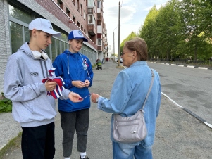 Волонтёры Победы города Ковдор, при поддержке МКУ Управление образования Ковдорского муниципального округа, провели ежегодную молодёжную акцию «Наш любимый белый, синий, красный». В рамках акции ребята поздравляли с праздником жителей города, вручали ленты триколор, наклейки, провели викторину на знание символов и атрибутов государства.