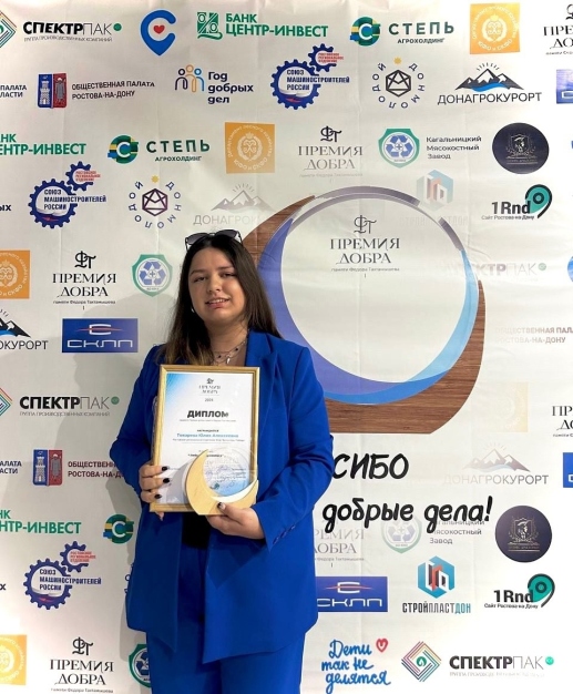 В этом году премией Добра, за свой вклад в духовно-нравственных ценностей и патриотического воспитание на территории Ростовской области, была отмечена пресс-секретарь Ростовского регионального отделения ВОД «Волонтёры Победы» Токарева Юлия. За 4 года её работы в медиа нашего движения, на страницах социальных сетей регионального отделения, из-под её пера вышло много публикаций на патриотическую тему, также она является активным участником и организатором мероприятий регионального отделения.