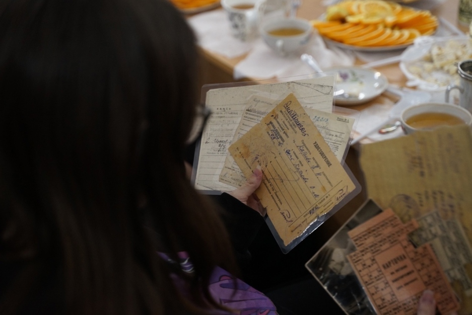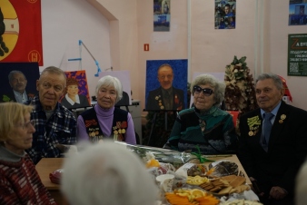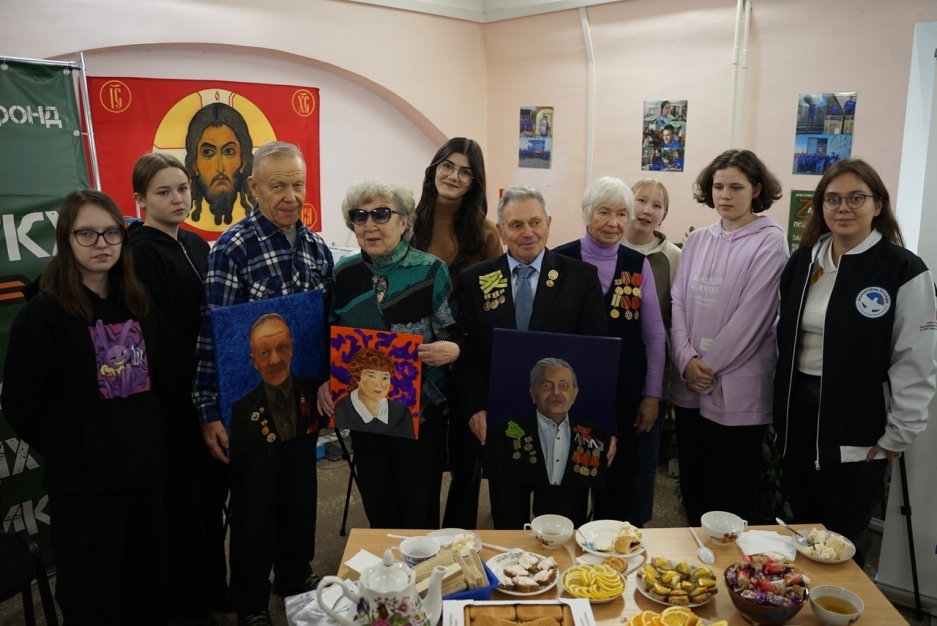 А также за чашкой чая смогли, из первых уст племянницы, послушать историю Михаила Ильича Кошкина - конструктора танка «Т-34». Совместно со студентами колледжа пищевой промышленности вручили ветеранам портреты, нарисованные волонтёрами.