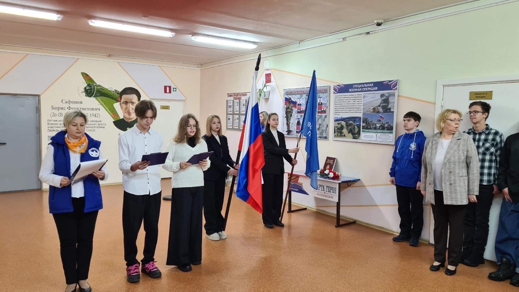 В школе № 4 города Полярные Зори прошла тематическая линейка. Её провела знамённая группа, вынося флаги Российской Федерации и Волонтёров Победы. Почётную вахту памяти у парты Героя и стендов Героев-земляков несли Волонтёры Победы. Добровольцы посетили занятия «Разговоры о важном», где говорили о Героях и их подвигах.
