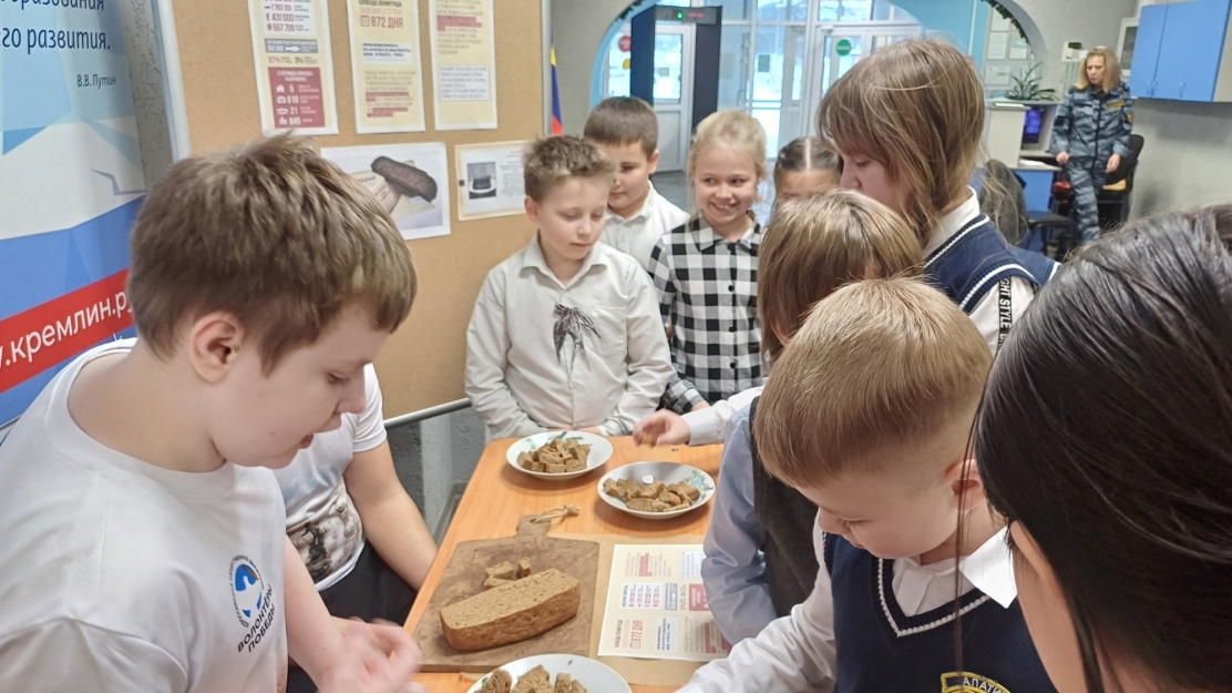 Школьный отряд Волонтёров Победы школы № 1 ЗАТО п. Видяево рассказал ученикам о блокадном хлебе, раздали символический кусочек хлеба и памятку. Ключевой символ акции – кусочек хлеба весом в 125 грамм: именно такая ежедневная минимальная норма была установлена во время блокады Ленинграда. Это символ стойкости и мужества защитников города, их подвига на фоне всех тяжестей военного времени.