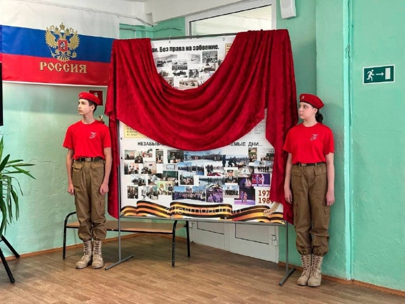 Почетное право открыть стенд памяти воинам-интернационалистам было предоставлено юнармейцам 8Б класса. Погибших участников почтили минутой молчания.