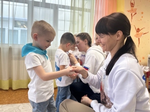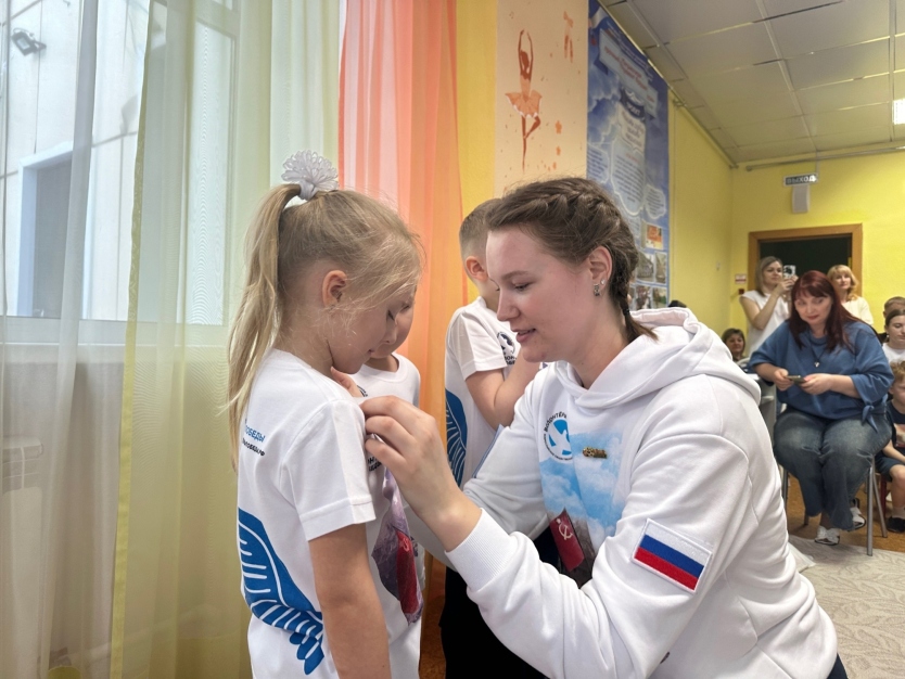 Юных волонтёров принимали в свои ряды заместитель руководителя регионального отделения Дарья Тагина и руководитель муниципального штаба города Новоалтайска Ксения Колесникова. Они повязали маленьким волонтёрам галстуки и прикрепили у самого сердца значки с эмблемой Движения.