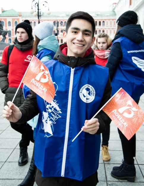 Студенты, волонтеры, юнармейцы и жители города выстроились в фигуры живой цифры 75 и двух звезд, образовав над головой флаг Российской Федерации.