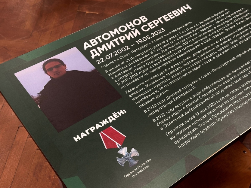 24 февраля 2025 года в актовом зале ГБОУ СОШ № 43 с углублённым изучением иностранных языков Приморского района состоялось открытие Парты Героя в честь Автомонова Дмитрия Сергеевича, который в 2020 году закончил эту школу, а в 2023 году ушёл добровольцем на СВО.