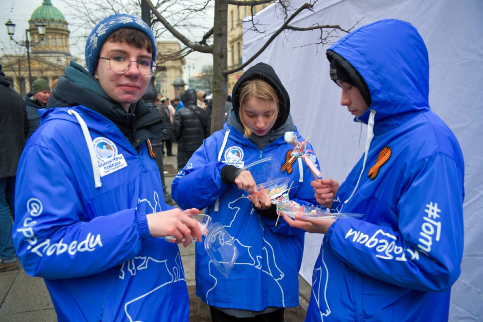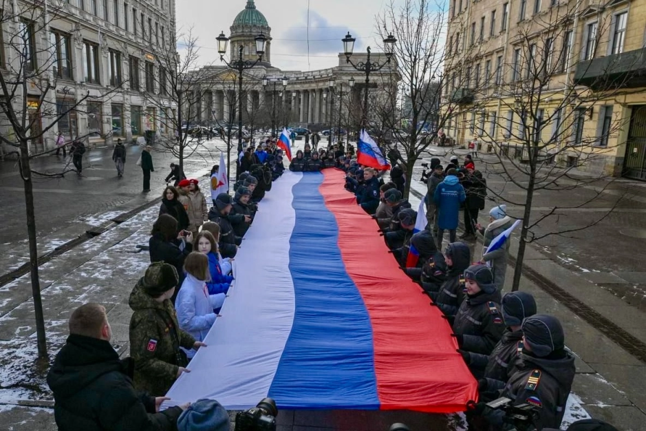На Малой Конюшенной улице Волонтёры Победы совместно с представителями других молодёжных организаций и студентами высших учебных заведений развернули огромное полотно российского триколора.