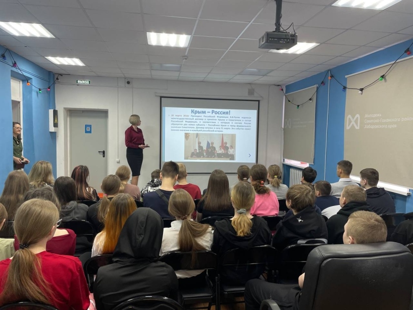 Волонтёры Победы Хабаровского района провели для молодежи презентацию «Крым и Россия. Мы вместе», где школьникам рассказали об истории Крыма, событиях марта 2014 года и его достопримечательностях.